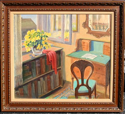HUNGARIAN INTERIOR SCENE, O/C: 28'' X 32'', signed lower left illegibly, faintly titled in Hungarian verso on the canvas, carved wood frame, 36'' x 40 1/4''.