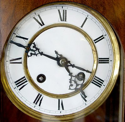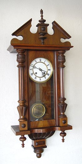 VIENNA REGULATOR CLOCK CA 1900: Enamel dial is in very good condition, time & strike movement, key and pendulum included, walnut case is 33'' x 11 1/2'' x 6 1/2'' overall.