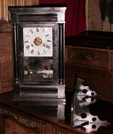 SETH THOMAS WEIGHT DRIVEN OGEE CLOCK: Reverse painted tablet in door depicting an early 1800's village scene. 25'' x 15''w. x 4 1/4''d. Two weights, crank key and pendulum. Sold with wall shelf for display.