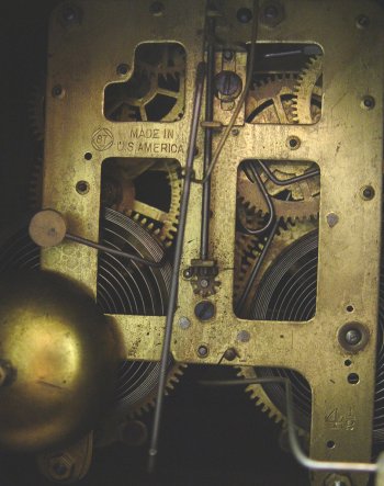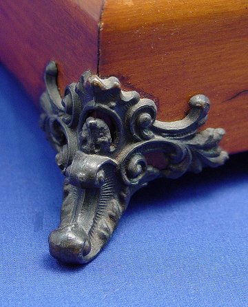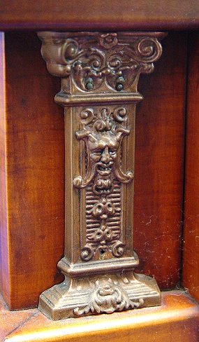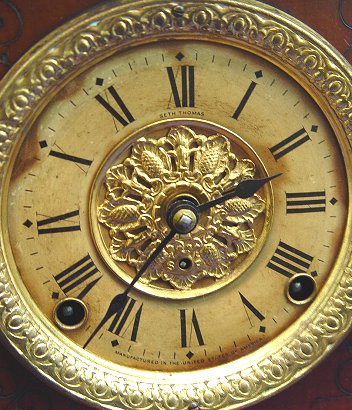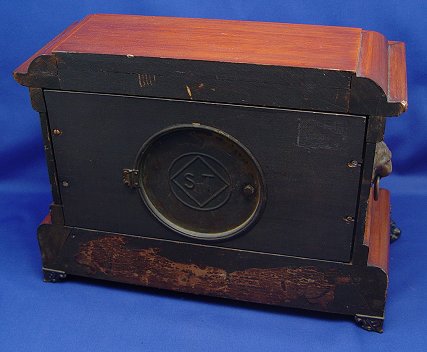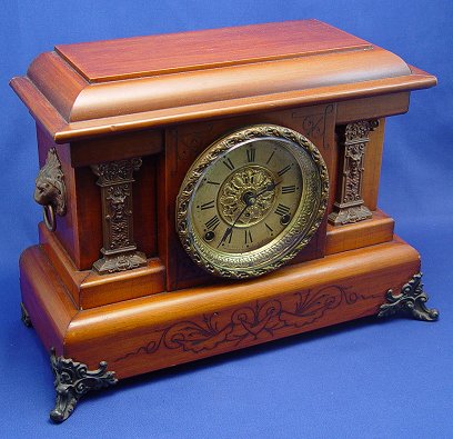 AESTHETIC MOVEMENT SETH THOMAS MANTLE CLOCK: Lion's head handles and ormolu mounts to case, incised carving to apron. 11 1/2''h Ca 1880.