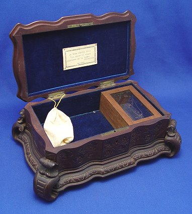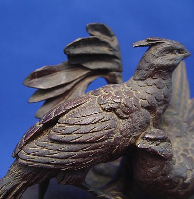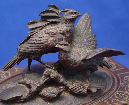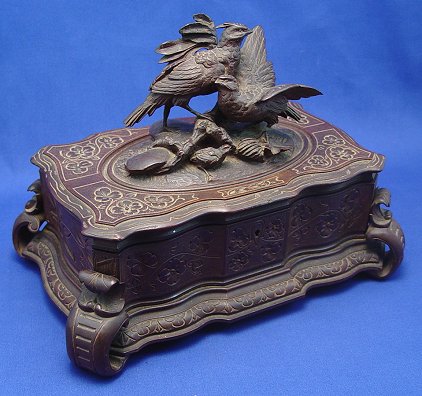 19th C CARVED SWISS MUSIC BOX: Carved box surmounted by a pair of carved birds. Music player is marked Switzerland. Please note early repair to one wing. Plays three songs, in good working order. 8 1/2''h. x 12'' x 8''