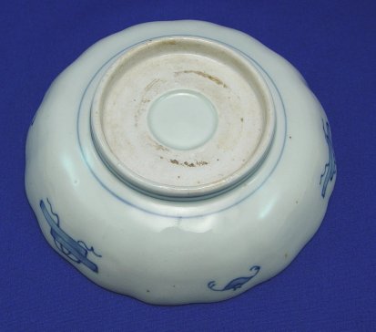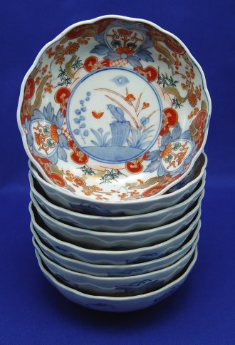 SET OF 8 JAPANESE IMARI BOWLS: Foliate border, delicately toned underglaze blue designs with red. Unglazed firing ring inside foot ring. Diam. 6'', 1.75'' deep.