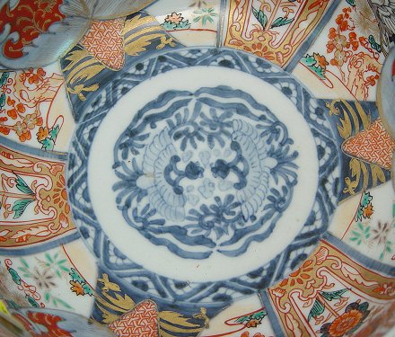 GROUP OF 3 JAPANESE IMARI BOWLS: Densely packed decoration on interior and exterior with motifs of crane, plums, and pine, gilded accents. Lobed rims, unmarked foot. Middle bowl has been repaired, 8.5'', 9.75'', 11''