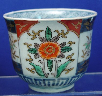 SET OF 12 JAPANESE IMARI TEA CUPS: Slightly flared rim. ''Three Friends of Winter'' underglaze blue medallion band. Unmarked. several have small chips, 2 on rims 2 on bottoms. 3.5'' diameter, 2 7/8'' high