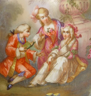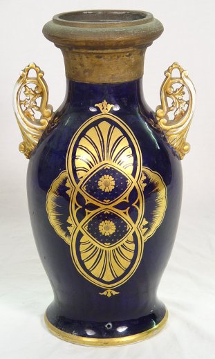 LARGE 19TH C GOLD DECORATED COBALT PORCELAIN VASE: Featuring a courting scene framed in gilded scrolls. Intricate pierced handles. Drilled to be used as a lamp, the gold is worn. The metal rim is a creative repair. 20 1/2''h.