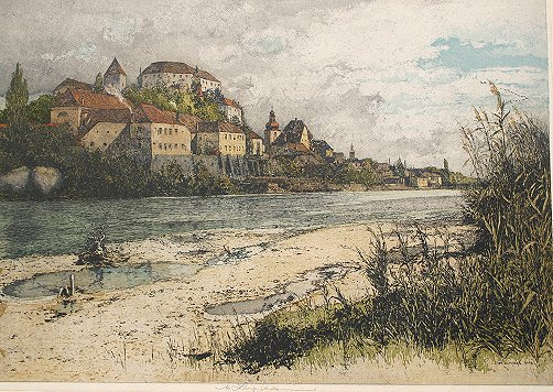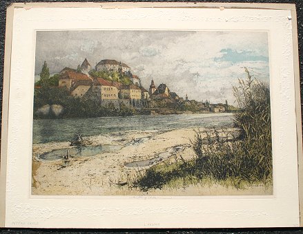VINTAGE LUIGI KASIMIR COLORED AQUATINT AND ETCHING: ''Pettau Castle'', print size with margins 23 1/2'' x 30 1/2'', estate signed lower margin, unframed. Condition - Laid on cardboard reinforcement, matting glue adhered to margins and as a result there is some paper loss but does not affect the image.