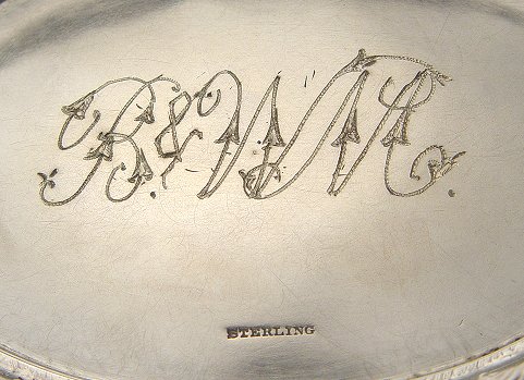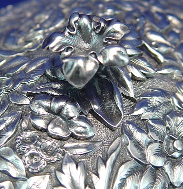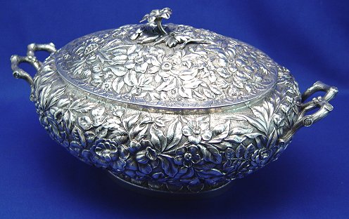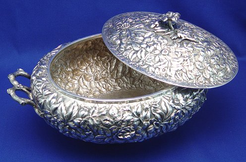 STERLING REPOUSSE COVERED SERVING DISH: Overall floral design on pedestal base. The base is done in a leaf design. Floral finial, branch form handles. Monogrammed on the bottom underside. Dent free. 12''l, 6 1/4''h. Approx. 41.83 oz. Stamped ''Sterling'', no visible makers marks.