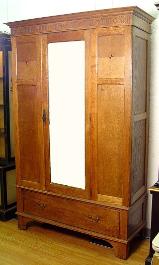 GOLDEN OAK ARMOIRE: Single mirrored door, carved frieze along the top, inlay stars flank the center door. Interior clothes bar and later shelf addition. Full length drawer across the bottom. 80''h. x 47''x 18''.