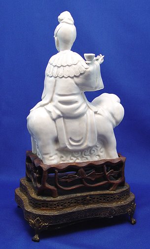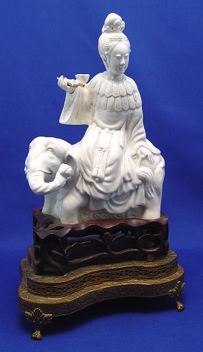 CHINESE BUDDHISTIC BLANC DE CHINE ELEPHANT & RIDER: Double mounted on a wooden base and reticulated brass base. 13''h. x 8''w.
