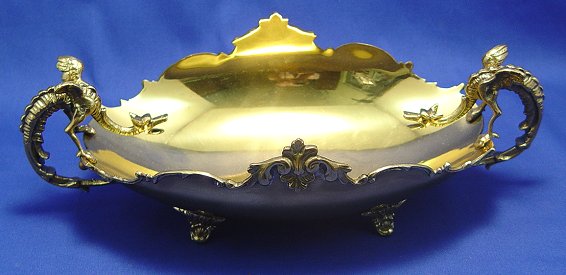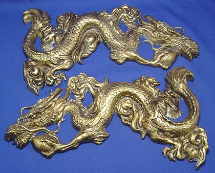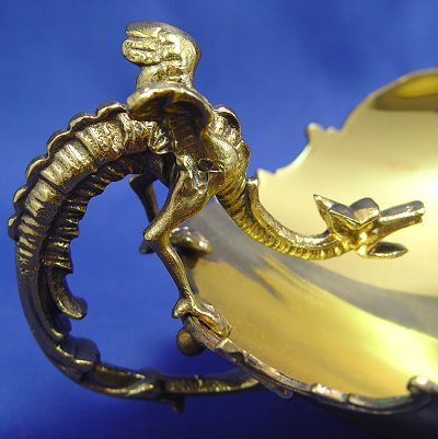 BRASS DRAGON HANDLE CENTER BOWL AND SCONCES: Bowl with dragon handle, 15''l, sold with a pair of wall mount decorative mounts, 15''h.