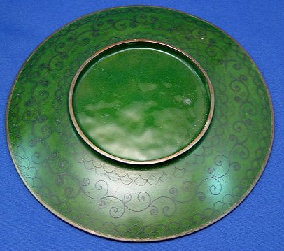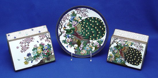 INABA CLOISONNE BOXES AND PLATE: 1) Peacock motif box, 4'' x 5.5'' x 2''. 2) Flower and butterfly motif Box 4.5'' x 3.5'' x 2''. 3) Peacock motif plate, 7'' dia. The peacock box is signed S. Inaba Kyoto. Sold as a Lot.
