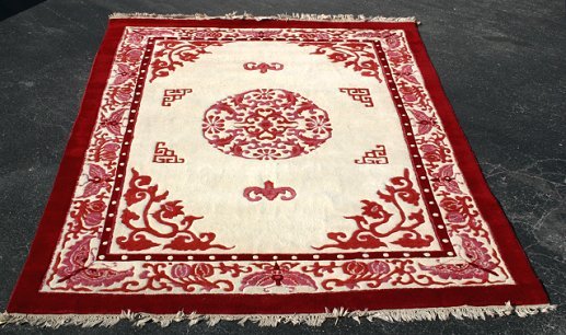 SCULPTED CHINESE STYLE CARPET: Hand tied in India. The most unusual color combination of fuchsia and magenta. Approx, 9' X 12'.