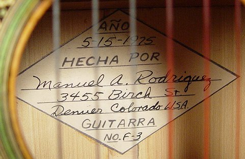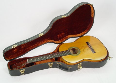 FINE HAND CRAFTED CLASSICAL GUITAR: The consignor tells us this guitar was made by Romero. Interior label reads ''Ano 5-15-75 Hecho por Manuel Rodriguez .... Guitarra No. F-3. Approx. 100'' long. Very good condition, sold with the case.