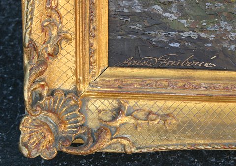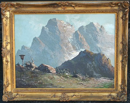 FRABOUE, Arnoh, (European, 20th C): Alpine landscape, O/C, 23 3/4'' x 31 1/2'', signed lower left, encased in fine pierce carved gilded gesso molding, does have minor wear, measures 30'' x 38''.
