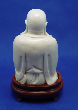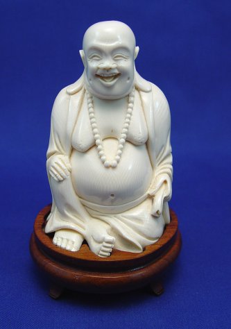 CARVED IVORY BUDDHA: Happy Buddha, 4 1/2''h., with custom carved wooden base, 5 1/2''h overall.