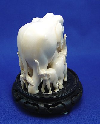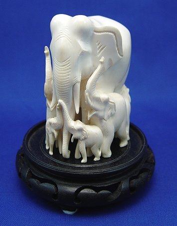CARVED IVORY ELEPHANT GROUP: Larger elephant graced with seven smaller elephants. Carved from one piece. Ivory is 4''h., 3'' dia., 5 1/2''h. overall on wooden base.