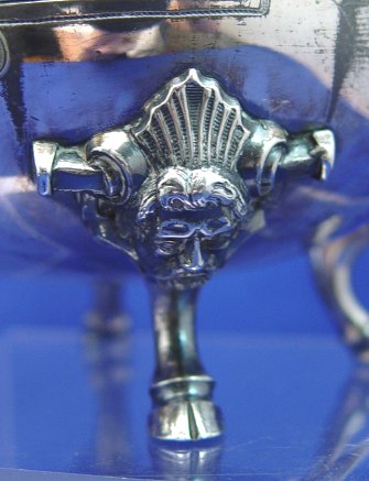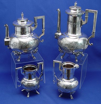 MERIDEN VICTORIAN SILVER PLATE TEA SERVICE: 4 pieces include teapot, coffee pot, sugar and cream pitcher. The silver is worn, a finial is crooked, but the details of the feet are superb. A masqueron leads into hoof feet. The coffee pot is 10''h.