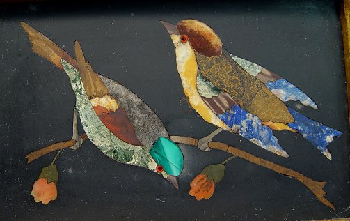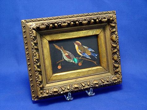 19TH C PIETRA DURA BIRD PLACQUE: Inlaid marble in a bird motif, framed in a gilt gesso period frame (small bits of gesso loss). Marble is free of cracks 3 1/2'' x 5''. 6 1/2'' x 8 1/2'' overall.