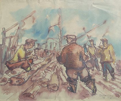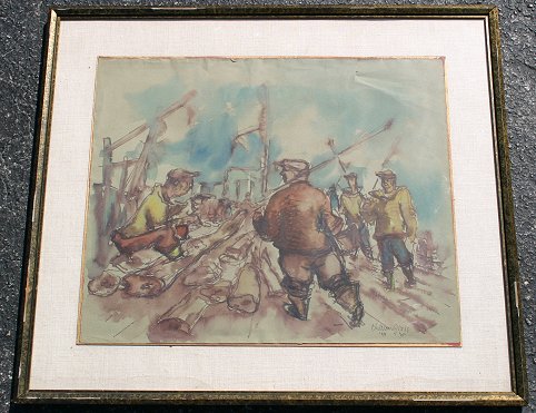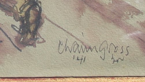 GROSS, Chaim, (American, 1904-1991): ''Fishermen-Provincetown'', W/C, 16'' x 19 1/4'', signed lower right, dated '41, remnants of an old exhibition label verso. Condition - Laid on cardboard, tear in upper right corner.