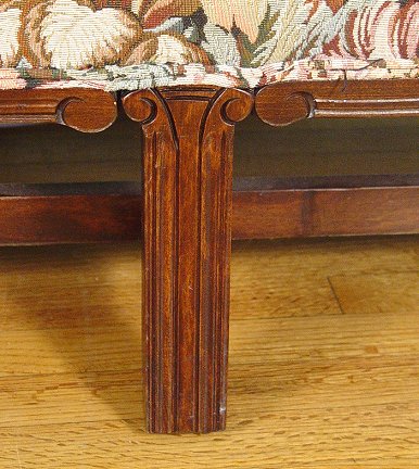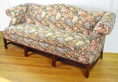 CHIPPENDALE STYLE CAMEL BACK SOFA: Upholstered in all over floral pattern with mahogany legs.
