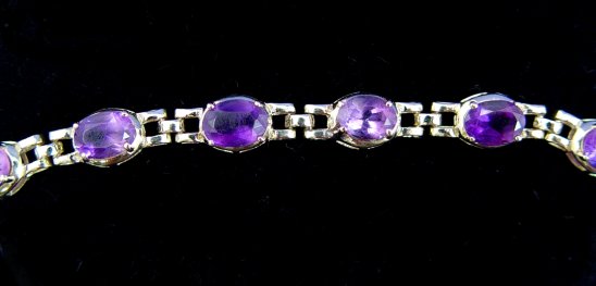 LOVELY AMETHYST BRACELET: 12 oval cut amethyst, approx. 7 x 5 x 3.2mm each, set in line bracelet of 14k yellow gold, 7''l., 10.7 grams.