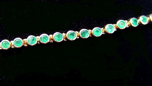 EMERALD TENNIS BRACELET: 14k yellow gold links individually bezel set with 34 tiny emeralds, approx. 3.3 x 1.8mm, 6''l., pressure clasp with double safety missing the receiver side so will need repair or re-make into earrings, 9.5 grams.