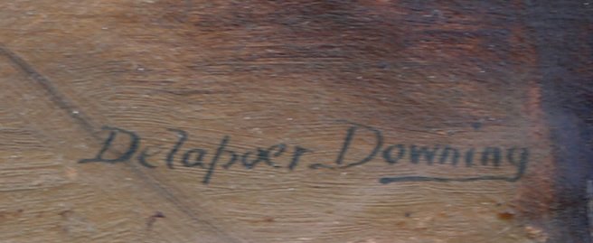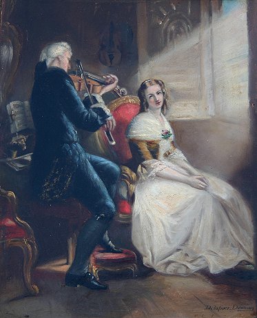 DOWNING, Delapoer, (European, 19th C): Violin lesson, O/C, 12 1/8'' x 9 3/4'', signed lower right, encased in period pierce carved and over-painted gesso frame, 17'' x 14 1/2''. Condition - Several spots in the margin show wear, there is some paint loss in the lower portion of his coat.