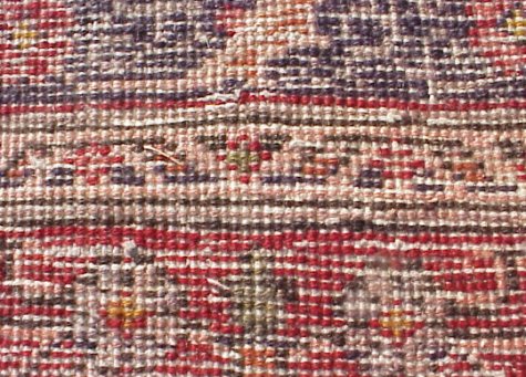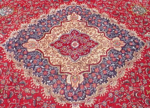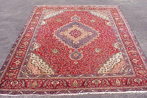 HAND TIED PERSIAN CARPET: Approx. 10'5'' X 7', red ground, shows wear.