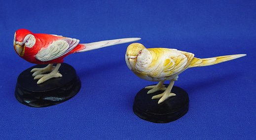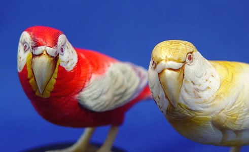 TWO JAPANESE OKIMONO CARVED AND COLORED IVORY BIRDS: Life like rendition in ivory of red and a yellow parakeet. Each approx. 6''l., they stand about 2''h.