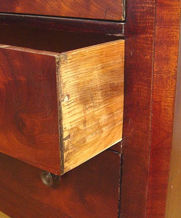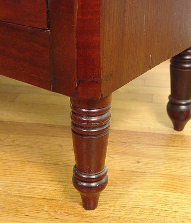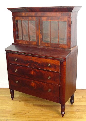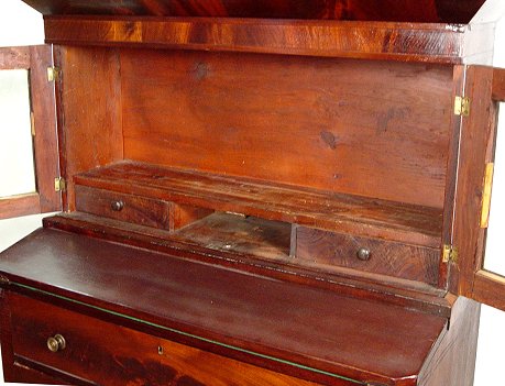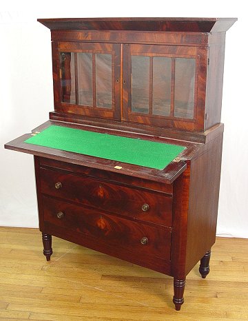 1830'S FEDERAL SECRETARY BOOKCASE: Two part desk, upper section with molded cornice, glazed doors. Lower section with flip top, felt covered desk. Turned legs. 59 1/2''h. x 39 1/2'' x 18''.