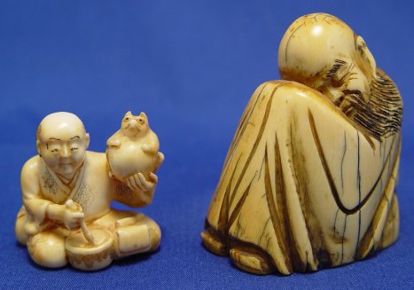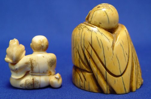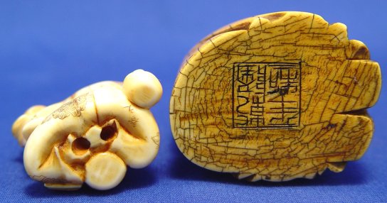 TWO IVORY CARVINGS: Man napping with his head on his knees, overall cracking and crazing, 2 1/4'', signed on bottom and a netsuke in the shape of a man and chubby animal, signed on bottom, approx. 1 1/4''h. Sold as a lot.