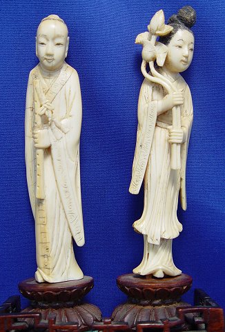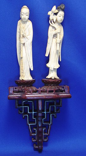 PAIR OF DIMINUTIVE CARVED IVORY STATUES: Man holding flute, generalized cracking, 5 1/2''h.; woman holding lotus blossom, better condition, 5 5/8''h.; both marked China on bottom, attach to carved wooden stands by double pegs and setting on small carved wall sconce. All pieces in place 11 1/2''h. overall.
