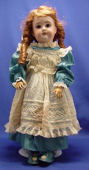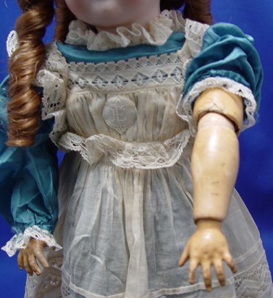 ANTIQUE GERMAN BISQUE FLORADORA DOLL: Beautiful complexion on bisque head marked Made in Germany Floradora A 6 11. Painted brows and lashes, brown sleepy eyes, open mouth. Fully jointed composition body with minor wear to the fingers. 20'' tall.