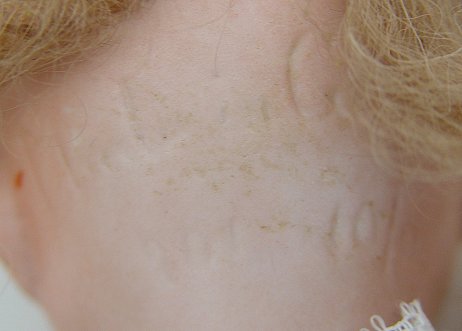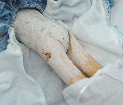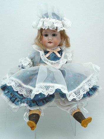 GEBRUDER KNOCH GERMAN BISQUE HEAD DOLL CA. 1887-1918: Original head and body. Sleepy brown eyes, open mouth with 5 teeth. Marked with the cross bones mark. Body and limbs are an early wood composition with painted shoes and socks. Made in Germany. Later dress and hat. 13'' tall.