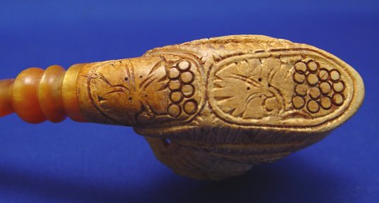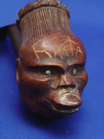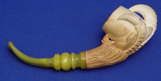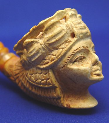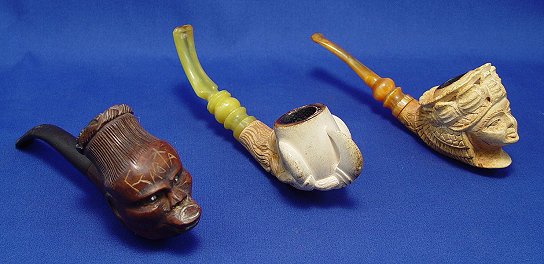 3 CARVED PIPES: Two Meerschaum pipes, one carved as a claw, the other as a queen. The briar pipe carved as a Rasta man is hand carved in the USA. All are in used condition.