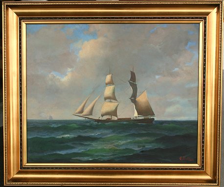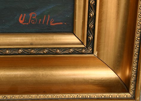BILLE, Willy, (Danish, 1889-1944): Clipper ship at sea, O/C, 27 1/2'' x 34'', signed lower right, original gilded frame with wear, 35 1/2'' x 41 3/4''. Condition - Very faint craquelure, some flecks of minor paint loss, patch visible verso.