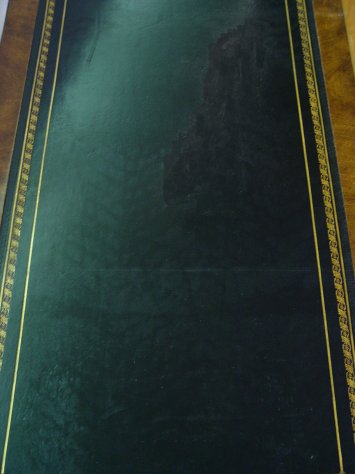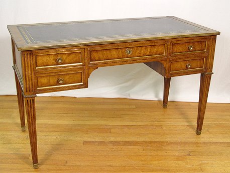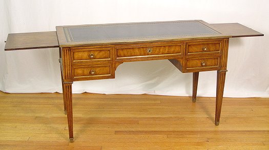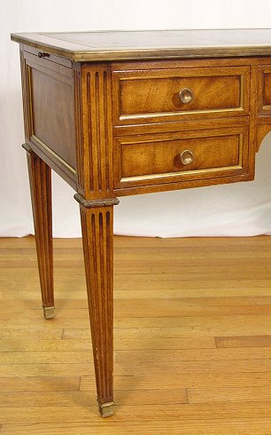 CONTEMPORARY ORMOLU MOUNTED LEATHER TOP DESK: 4 drawer case with central drawer, all of which are banded with ormolu, fluted columns and legs ending in ormolu spade feet. Black inset leather top, gilt banded with floral design. 29 1/2''h x 48''w x 22''d. Superior construction and condition.