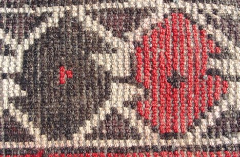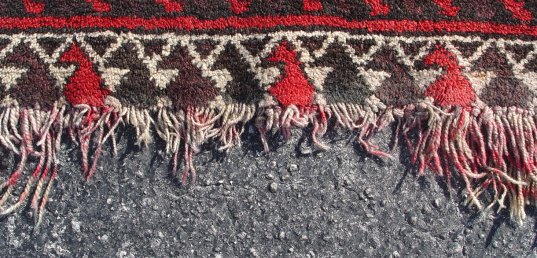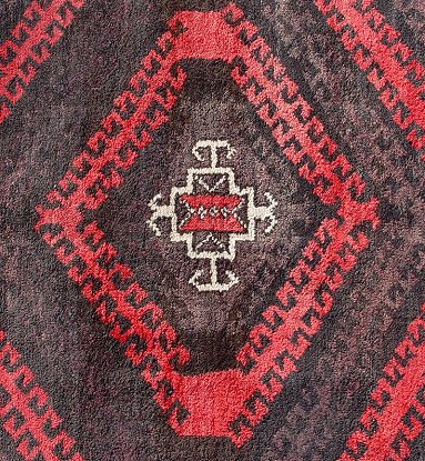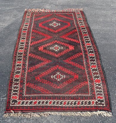 ORIENTAL CARPET RUNNER: Vibrant red and black, some wear to fringe, approx. 8' x 4'1''.