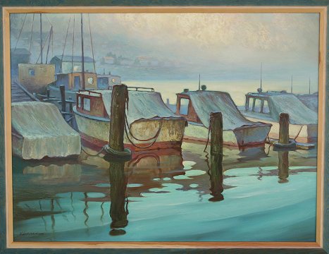 SHKURKIN, Vladimir, (American, 1900-1990): Nocturnal dockside scene, O/C, 27'' x 36'', signed lower left, contemporary blue grain wood frame.