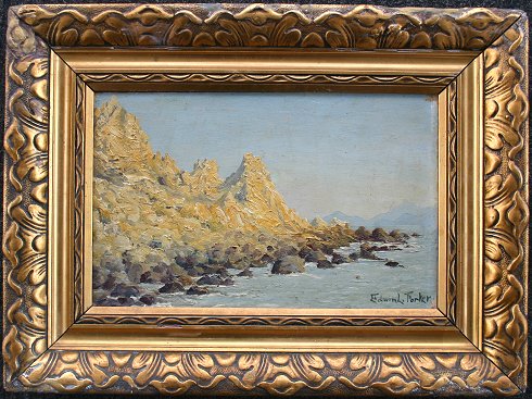 FORKER, Edwin, (American, 1876-1958): Coastal view, O/CB, 9 1/2'' x 14 3/4'', signed lower right, encased in an embossed gessoed frame with wear, repair and gilt loss, 15'' x 20 1/4''. Condition - Shows evidence of frame rub in the right margin, needs cleaning.