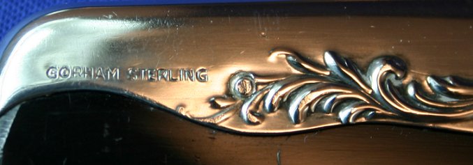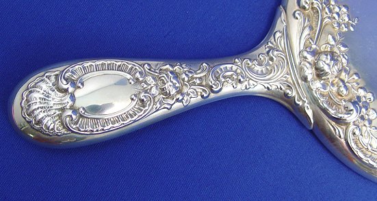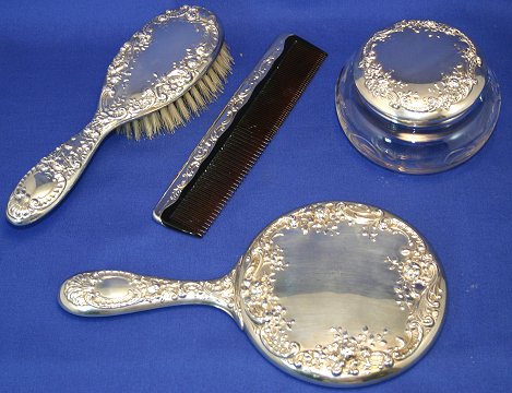 GORHAM STERLING DRESSER SET IN THE STRASBOURG PATTERN: To include, brush, comb, hand mirror and etched glass dresser jar. No monogram.
