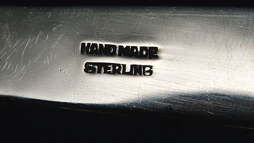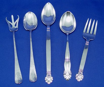 5 HAND WROUGHT STERLING SERVING PIECES: To include, two by Lebolt, long handled spoon and a pierced fork?, approx. 9''l. each; spoon marked JOR, 8 3/4''; matching stuffing? spoon 10 3/4'' and meat fork 8 1/4''. Last three with Jensen style design. Overall 12.5oz.