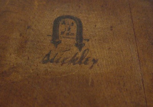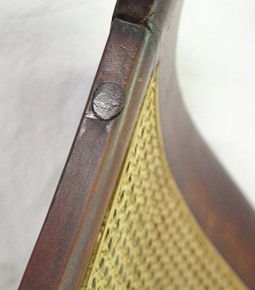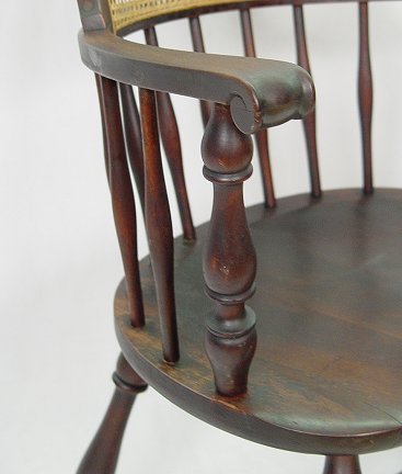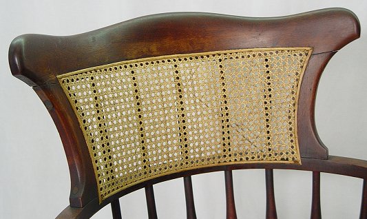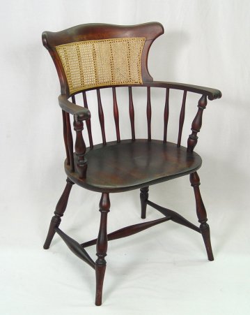 STICKLEY WINDSOR TYPE COLONIAL CHAIR: Impressed with the joiners compass mark on the underside along with Stickley. Mahogany chair caned panel in the back along with spindles. 365''h. x 25 12/'' x 15 3/4''.