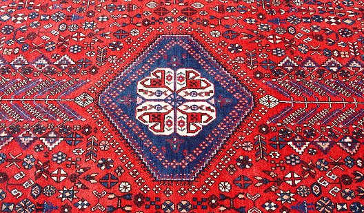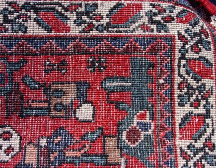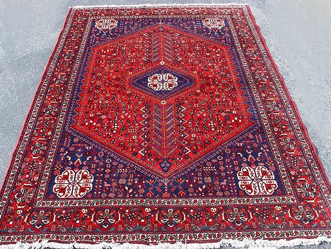 HAND TIED PERSIAN CARPET: Deep red and blue, approx. 9'10'' X 6'9''