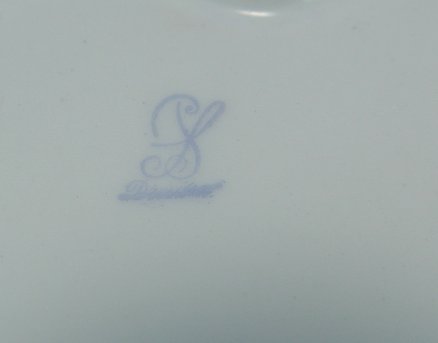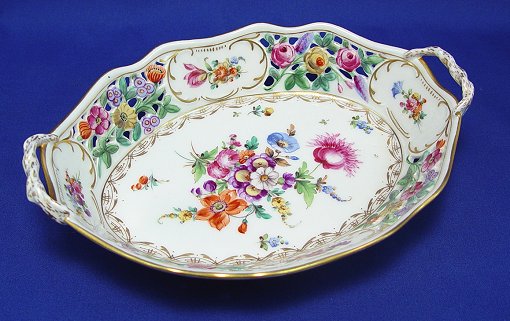 DRESDEN PORCELAIN HAND PAINTED RETICULATED BASKET: Floral motif painted on the exterior and interior. Branch form handles. 2 1/2''h. x 10''.