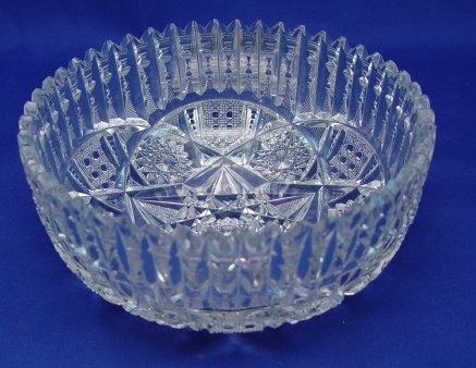 SIGNED LIBBEY AMERICAN BRILLIANT CUT GLASS BOWL: Cut in hobstar, caning and notches, 8'' dia. Free of chips and cracks.