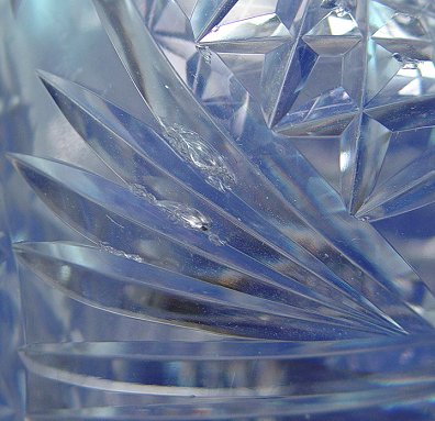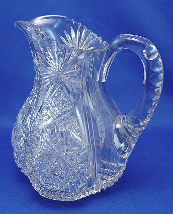 AMERICAN BRILLIANT CUT GLASS PITCHER: Highest quality. Lobed body with full length cuts and exaggerated notches on the handle. Minute chips on the base. 8 1/2''h.