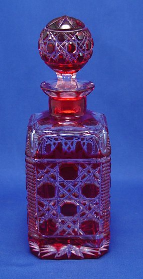 AMERICAN BRILLIANT CUT GLASS TRAY AND A CRANBERRY CUT TO CLEAR DECANTER: The round tray is 13 1/2'' dia. and very heavy. The decanter is 9 1/2''h.