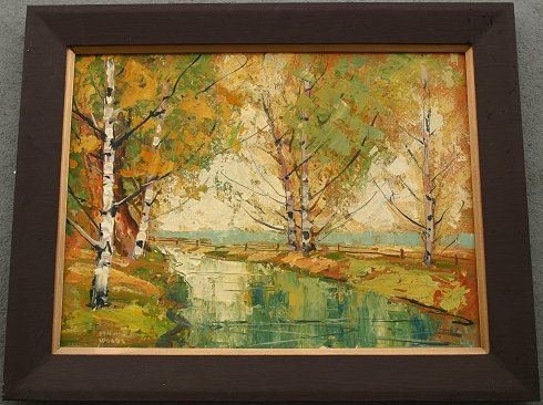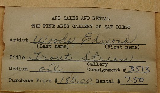 WOODS, Edmond, (American, 1905-1900): ''Trout Stream'', O/B, 18'' x 24'', signed lower left, encased in a painted brown frame, label affixed verso Art Sales & Rental, the Fine Arts Gallery of San Diego.