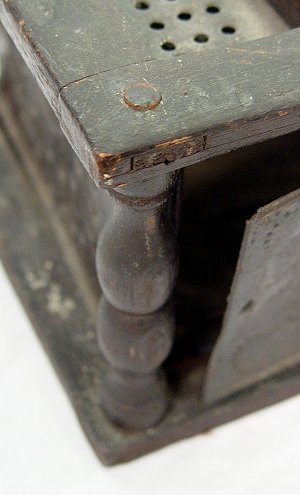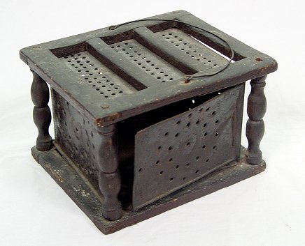 MID 19th C PUNCHED TIN FOOT WARMER: In mortised and pegged wooden frame. The tin punched designs feature hearts circles. Wire handle. 5 1/2''h. x 8 3/4'' x 7.